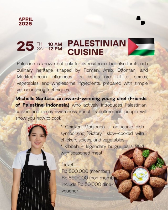 Join Chef Michelle Santoso, an award-winning young chef (Friends of Palestine Indonesia) who actively introduces Palestinian cuisine and raises awareness about its culture and people.