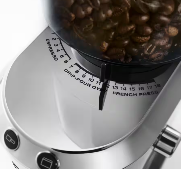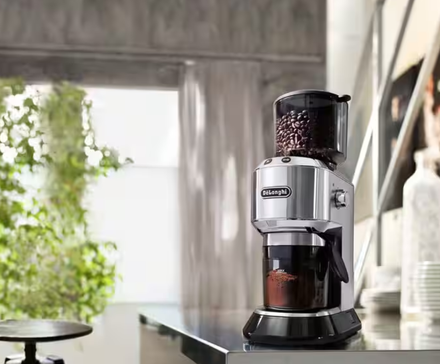 The Dedica KG521.M is a conical burr coffee grinder made by DeLonghi Italy, designed for home use to grind coffee beans with adjustable fineness based on your brewing method (espresso, drip/pour-over, or French press).